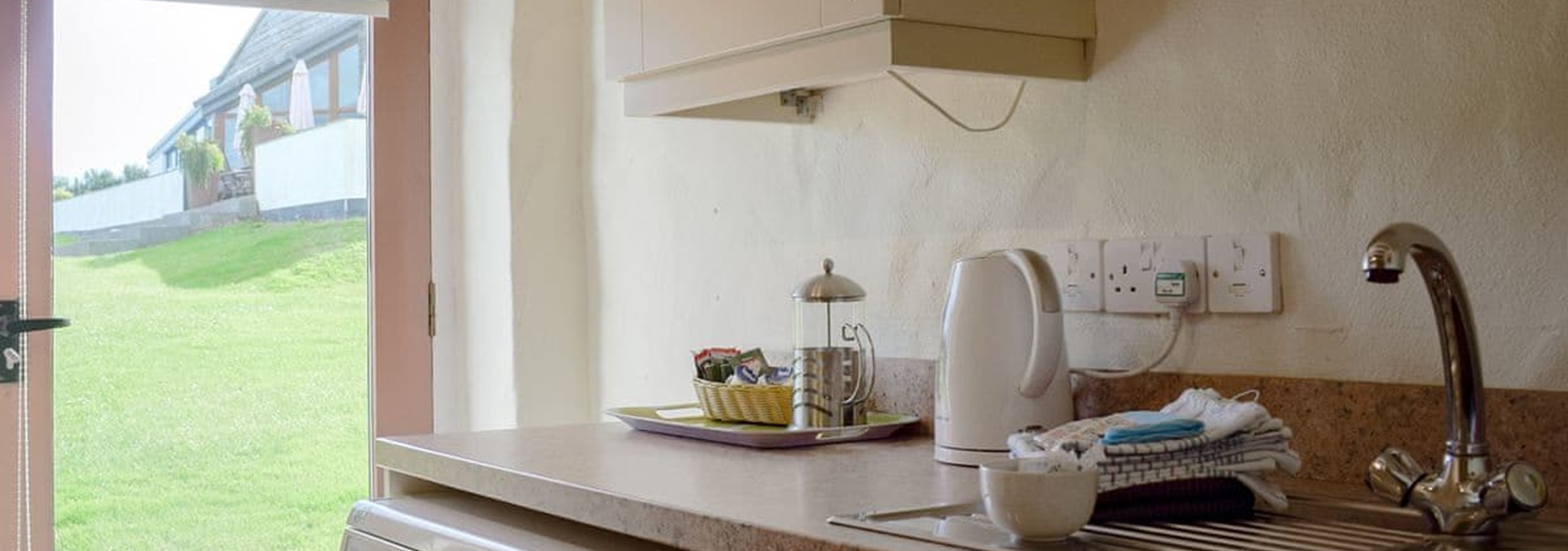Living/dining area. Modern kitchen with access to meadowland. Bedroom one with double bed, adjacent bathroom with shower attachment, toilet and wash basin.
