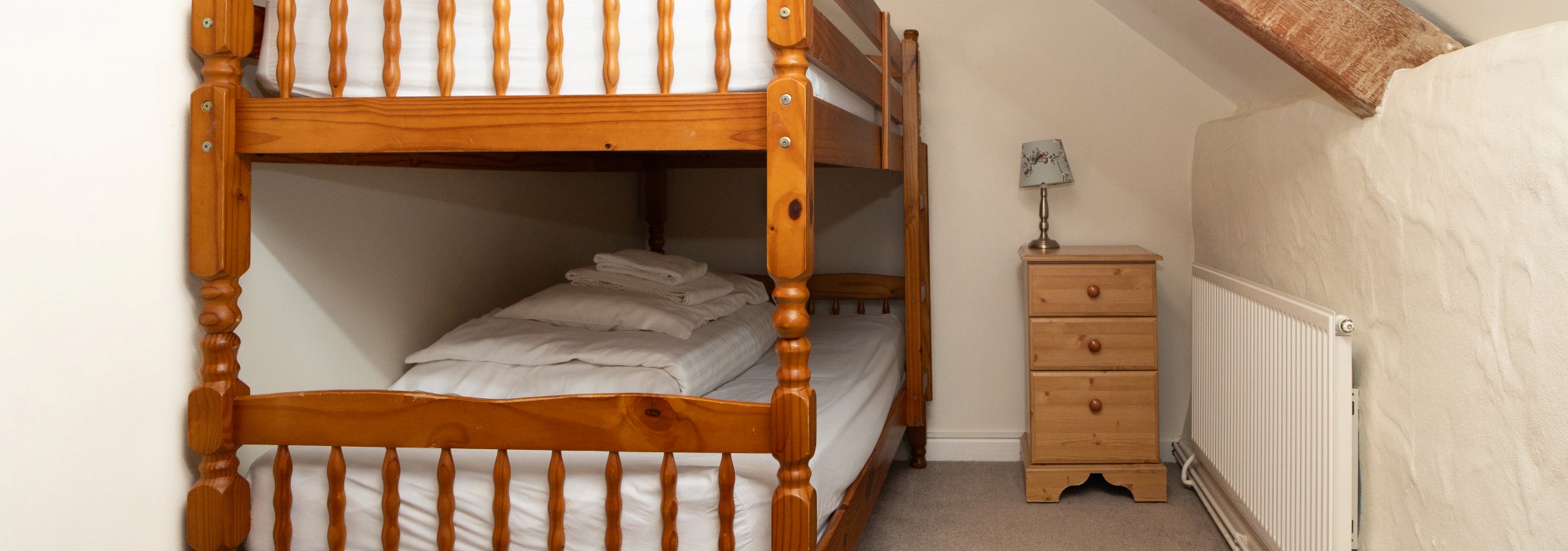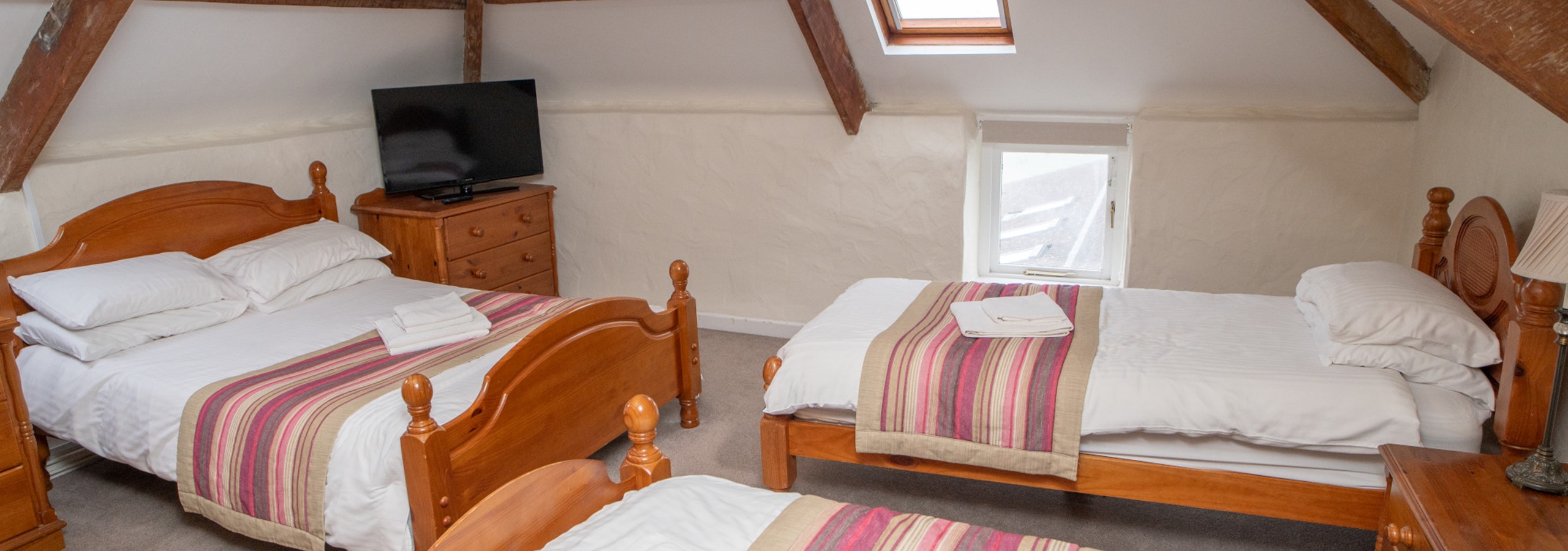• Bedroom two character, beamed family room with one double and two single beds. Bedroom three with double bed. Bedroom four with full size bunk beds. Bathroom with shower attachment, toilet and wash basin.