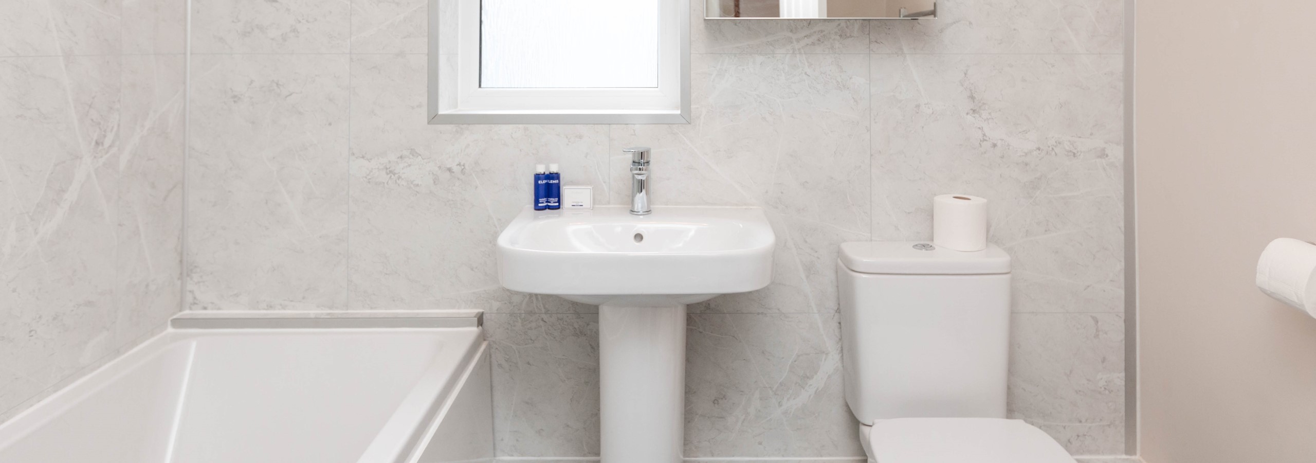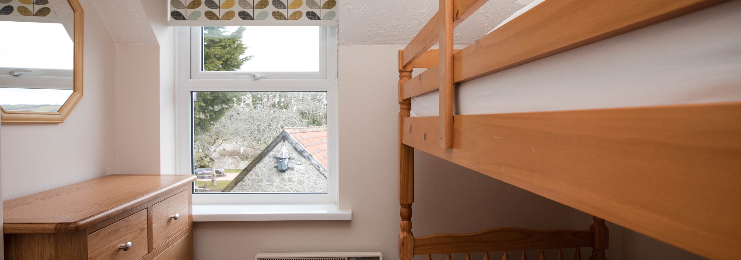Bedroom one with double bed. Bedroom two with twin beds. Bedroom three with full size bunk beds. Bathroom with in-bath shower, toilet and washbasin.