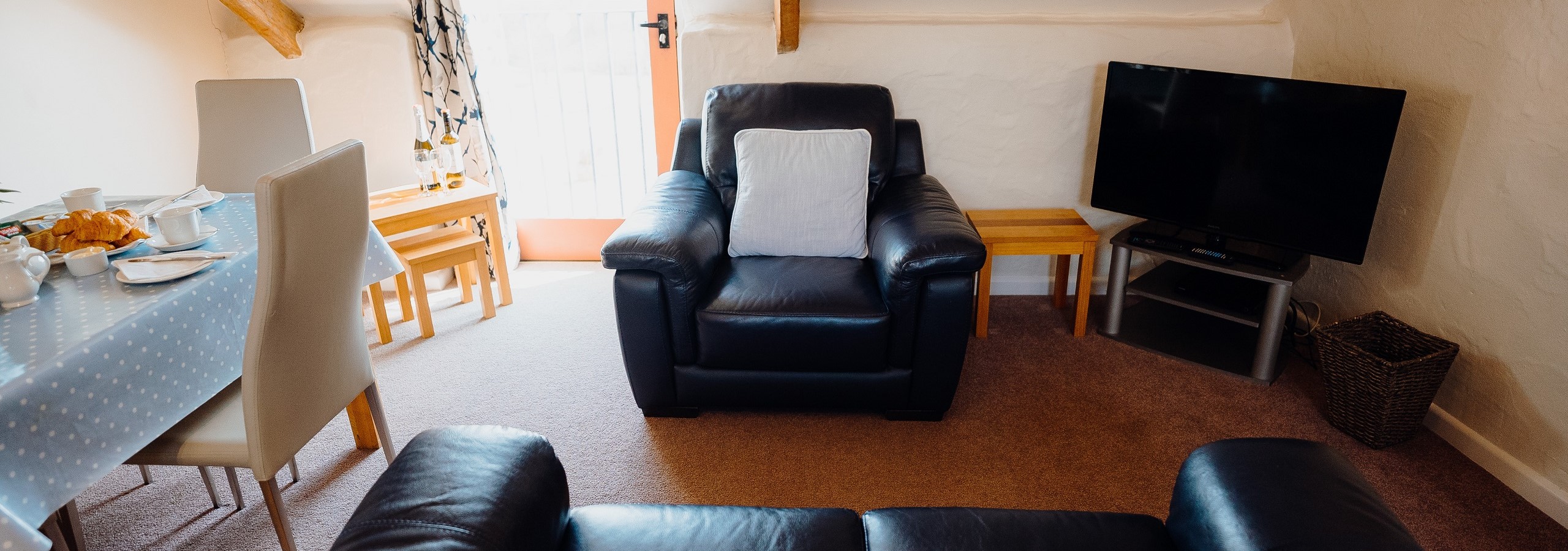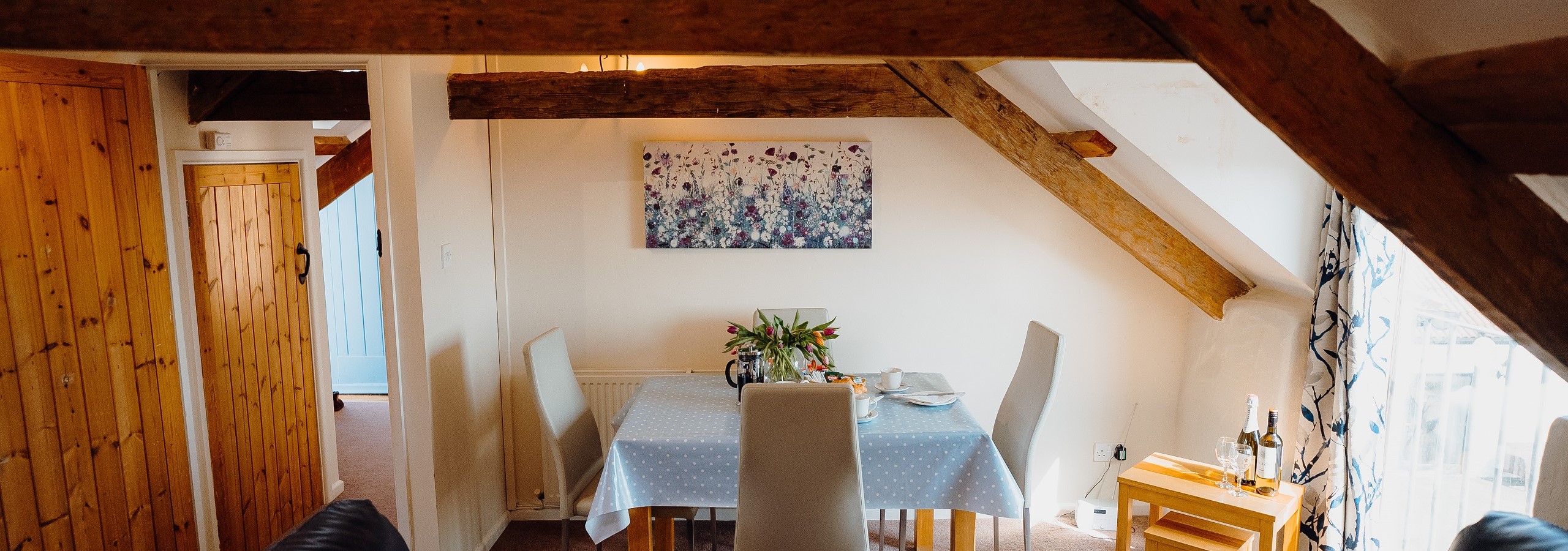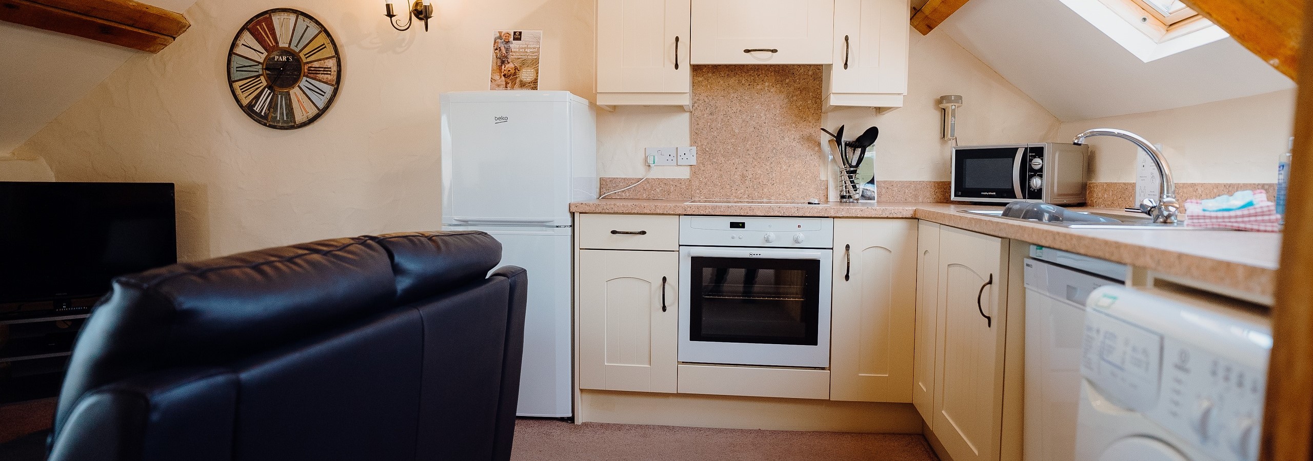 Modern kitchen opening out to lounge/dining area with lovely countryside views. Bedroom one with character low beams and double bed. Bedroom two with twin beds. Bathroom with shower attachment, toilet and wash basin.