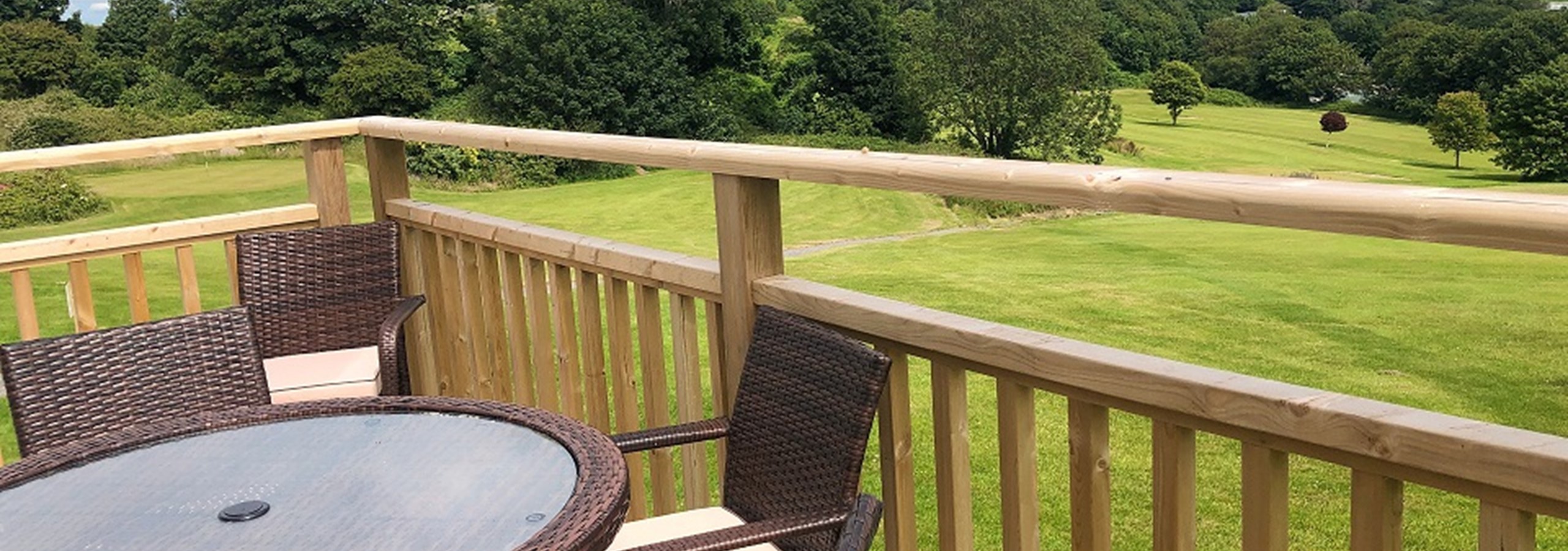 Wooden balcony overlooking the 9th green and the ocean beyond.