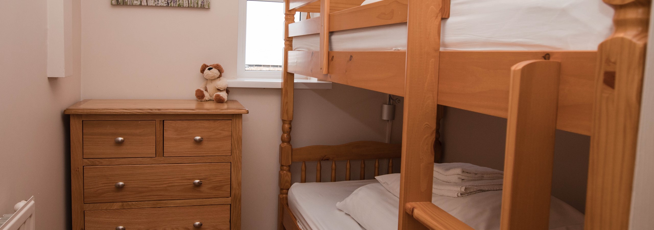 Living/dining room patio doors to garden. Kitchen. Bedroom one family bedroom with a double and a single bed. Bedroom two with full size bunk beds. Bathroom with in-bath shower, toilet and wash basin.